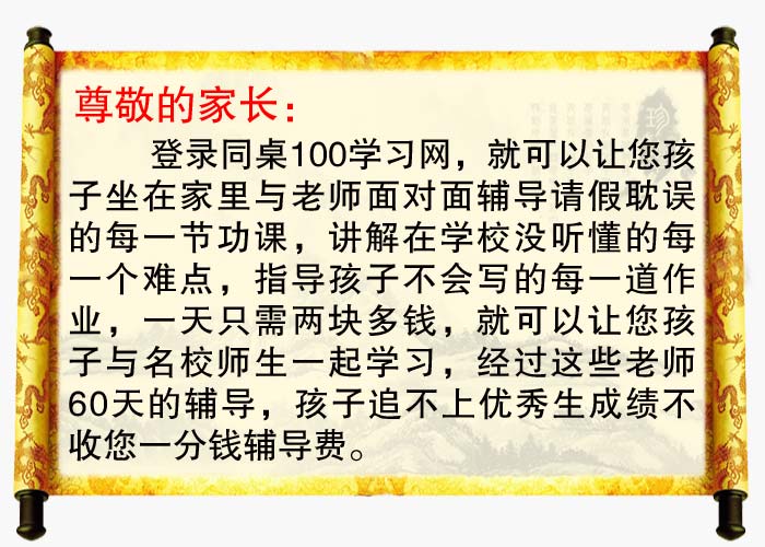 您请家教一节课需要200元,跟着同桌100学习网老师学习一天才2块钱;更重要的是您请家教孩子成绩就是不提高,您也照样付辅导费,而我们网站承诺:您孩子的成绩不提高不收您一分钱辅导费。
