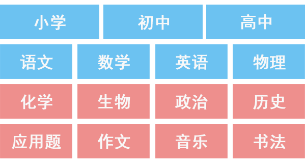 同桌100学习网不仅有小学一年级到高中三年级每门功课,而且还有应用题、书法、家庭教育等十几类专题区,从而满足不同孩子不同家长的需求。