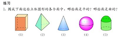 练习:1.围成下面这些立体图形的各个面中,哪些面是平的?哪些面是曲的?
