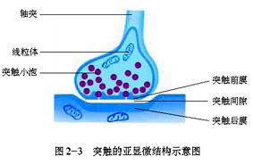 神经元的轴突末梢经过多次分支,最后每个小枝末端膨大,呈杯状或球状,叫做突触小体。突触小体可以与其他神经元的细胞体、树突等相接触,共同形成突触。图2-3是根据电子显微镜下看到的突触结构绘制的模式图。
