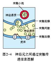 当神经末梢有神经冲动传来时,突触前膜内的突触小泡受到刺激,就会释放一种化学物质——神经递质。神经递质经扩散通过突触间隙,然后与突触后膜(另一个神经元)上的特异性受体结合,引发突触后膜电位变化,即引发一次新的神经冲动。这样,兴奋就从一个神经元通过突触传递到了另一个神经元。