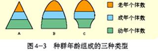 种群的年龄结构是指一个种群中各年龄期的个体数目的比例,大致可以分为右图所示三种类型(图4-3):