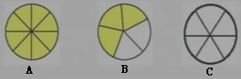 2、如图A、B、C三个可以自由转动的转盘,转盘被等分成若干个扇形,转动转盘,指针停止后,指向白色区域的概率分别是( )、( )、( )。