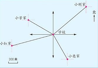 小刚说:学校在我家的____偏____的方向上,距离约是____米。