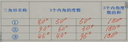 量出每个三角形每个角的度数,填入下表,再算出三角形三个角的度数。