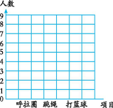 1.下面是四(1)班同学参加体育活动情况。用条形图表示出来。 项目 呼拉圈 跳绳 打篮球 人数 8 5 6