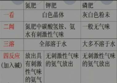 3、利用物理,化学性质的不同初步区分常见化肥的方法,如:看外观、加水、加熟石灰等方法。