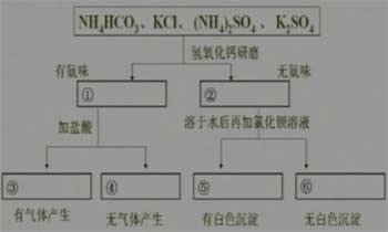 为鉴别NH4HCO3、(NH4)2SO4、KCI、K2SO4四种化肥,某同学设计了如下所示的实验方案,请你根据每步实验现象将有关化肥的化学式填写在下图相应的空格中。