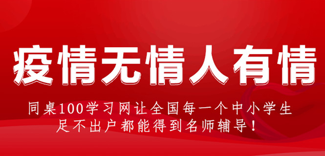 冠状病毒肺炎疫情牵动着每一个中国人的心,为全力配合停课不停学的教育工作要求,同桌100学习网在这个特殊时期,免费开放同步课堂,给每一个中小学生提供跟名师一起学习的机会,疫情持续多久,学生就可以免费学习多久!