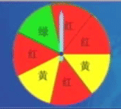 例2 如图十一个转盘,转盘分为7个相同的扇形,颜色分为红、黄、绿三种,指针的位置固定,转动转盘后任其自由停止,其中某个扇区恰好停在指针所指的位置(指针指向两个扇形的交线时。当做指向右边的扇形),求下列事件的概率: