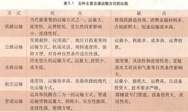 随着生产力水平的提高和科学技术的进步,交通运输方式从手提肩扛、牲畜驮运,发展到了现代化的铁路运输、公路运输、水路运输、航空运输和管道运输。这五种主要的交通运输方式各有特点,在社会生产和生活中都发挥着重要作用(表5.1)。