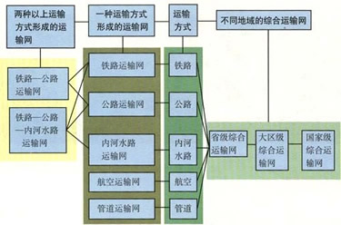在特定的地域范围内,根据地区经济的发展和人们活动的需求,各种现代交通运输方式联合,各种交通运输线(如铁路、公路、航道)、点(如港口、车站、航空港)交织,形成了不同形式和层次的交通运输网。
