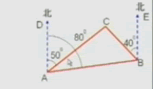 如图,C岛在A岛的北偏东50°方向,B岛在A岛的北偏东80°方向,C岛在B岛的北偏西40°方向,从C岛看A、B两岛的视角∠ACB是多少度?