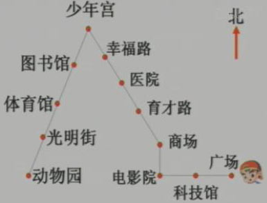 从广场出发向 行驶 站到电影院,再向 行驶 到站到商场 ,再向