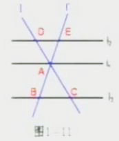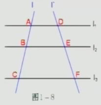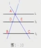观察图1-10和1-11,它们是图1-8的特殊情形,即L与L'的交点都在L上,根据平行线分线段成比例定理,可得AD/AB=AE/AC。