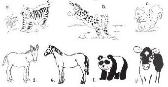 a lgopard a tiger a lion a donkey a fox a panda a squirrel