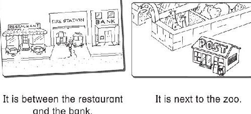 a movie theater a supermarket a hospital a park a train station a bus stop a post office a police station a swimming pool a library a bank a map a toilet a town a zoo a fire station between near