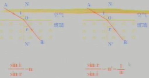 对不同的介质,常数n是不同的,例如:光从空气射入水中,n=1.33;光从空气射入玻璃,n=1.50.可见n是一个反映介质的光学性质的物理量。