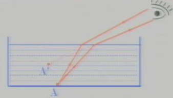 从A点发出的光线由水中射入空气时,折射角比入射角大,折射光线远离法线。折射光线进入眼中后,我们根据光沿直线传播的经验,就觉得它们是从A’点发出的,A’点在A的上方,所以看到容器的底部上升,水变浅了