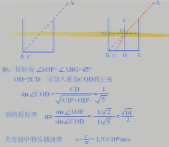 例题1:如图所示,一储油桶,底面直径与高均为d。当桶内无油时,从某点A恰能看到桶底边缘上的某点B。当桶内油的深度等于桶高一半时,由点A沿AB方向看去,看到桶底上的点C,两点C、B相距d/4,求出入射角和折射角的正弦