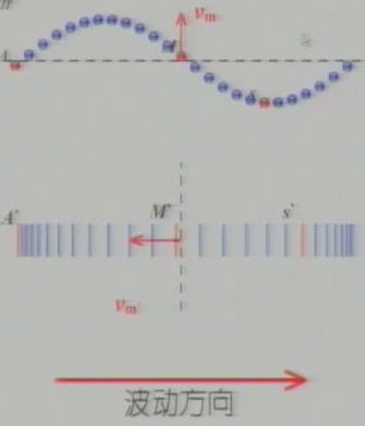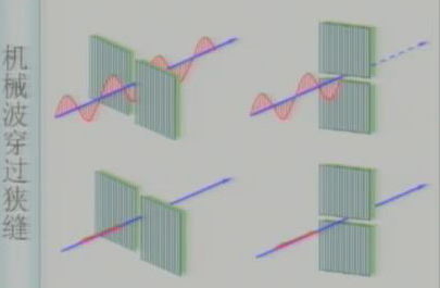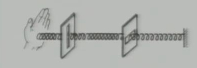 如果将这根绳换成细软的弹簧,前后推动弹簧形成纵波,则无论狭缝怎样放置,弹簧上的纵波都可以通过狭缝传播到木板的另一侧(如下图)