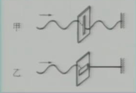 现在,让软绳穿过一块带有狭缝的木板,如果狭缝与振动方向平行,则振动可以通过狭缝传到木板的另一侧(图甲),如果狭缝与振动方向垂直,则振动就被狭缝挡住而不能呢过向前传播(图乙)。