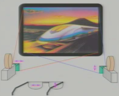 放立体电影时有左右两架放影机同时工作,如图所示,在每架放映机前装有一块偏振镜子,其偏振方向互相垂直,因此从放映机前偏振镜射出的两束偏振光的偏振方向互相垂直,这两束偏振光经屏幕反射其偏振方向不改变,观众眼睛做戴的偏振眼镜的两只镜片偏振方向互相垂直,且左眼镜片跟左边放映机前偏振镜的偏振方向一致,这样,左眼只能看到左边放映机映出的画面,右眼只能看到右边放映机映出的画面,两眼看到的画面略有差别,因而产生立体感。
