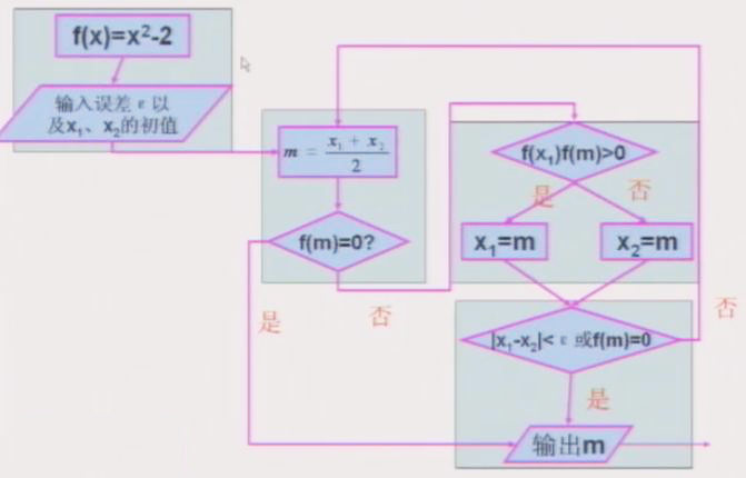 (2)平分区间:取区间中点m=(x1+x2)/2,判断f(m)是否为0,若f(m)=0,则m为方程的根,结束算法,否则,判断f(m)f(x1)的符号。