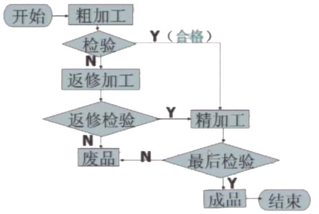 例2:工厂加工某种零件有三道工序,粗加工,返修加工,和精加工。每道工序完成时,都要对产品进行检验,粗加工的合格品进入精加工,不合格品进入作为废品处理,精加工合格成品为成品,不合品为废品,试用流程图表示零件的加工过程