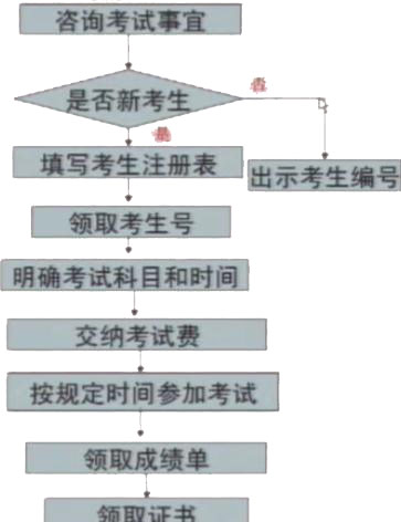 在考试之前咨询考试事宜,如果是新生,需要赶写考生注册表,领取考生编号,明确考试科目和时间,然后缴纳考试费,按规定时间参加考试,领取成绩单,领取证书;如果不是新生考生,则需出示考生编号,明确考试科目和时间,然后缴纳考试费,按规定时间参加考试,领取成绩单,领取证书,设计一个流程图,表示这个考试流程。