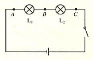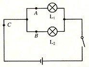 在下图中,两个灯泡L1、L2是串联起来街道电源上的。流过A、B、C各点的电流之间可能有什么关系?作出猜测。