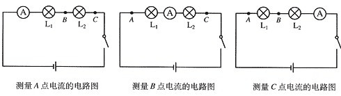 分别把电路中A、B、C各点断开、把电流表接入,测量流过的电流,看看它们之间有什么关系。换上另外两个小灯泡,再次测量三点的电流,看看是否还有同样的关系。