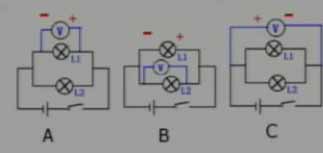 3、说出A、B、C中用电压表测灯泡电压不恰当的地方。