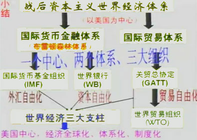 (1)三大支柱:(世界银行)、国际货币基金组织的成立,《关税与贸易总协定》的签订,在此基础上,资本主义经济体系形成。
