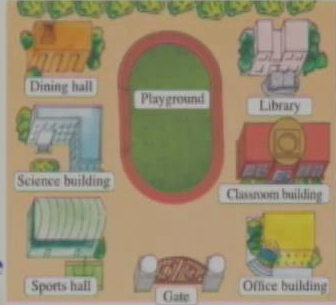 The science building is (in front of)the dining hall and the (playground)is on the left.Behind the dining hall,the playground the library there are some (trees).