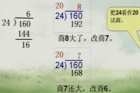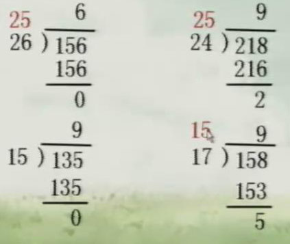 2.再计算三位数除以两位是时,如果除数接近几十五,就把除数看作几十五来试商,比较简便