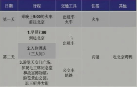 第一天晚上可以在火车上过夜,第二天早晨到北京,这样比较节省。还要调查各种项目的费用,像交通、住宿....