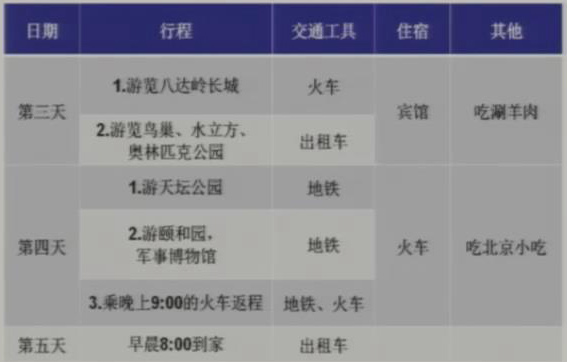 快放暑假了,小明期待着假期与爸妈参加“北京五日游”。爸爸妈妈把这个旅游计划的设计任务交给了小明,同学们,你能帮小明设计一个旅游计划吗?