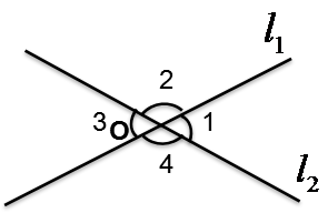 一:两条直线相交于点O,形成了四个角。∠1、∠2、∠3、∠4