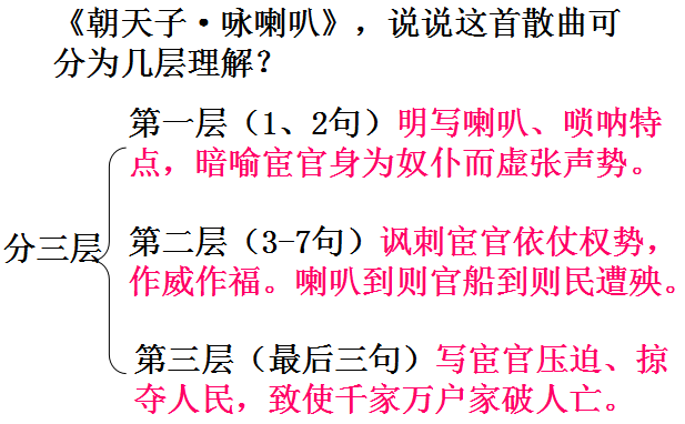 这首散曲表面是吟咏喇叭,实际上是借物咏怀,讽刺和揭露了明代宦官狐假虎威,残害百姓的罪恶行经,表达了人民的痛恨情绪。