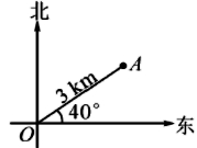 C. 在O点北偏东40°方向,距O点3 km的地方