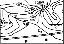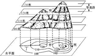(1)在等高线地形图上,可以判断海拔和相对高度。图中等高距为________米;海拔最高处不会超过________米;乙、丙两点的相对高度为________米。