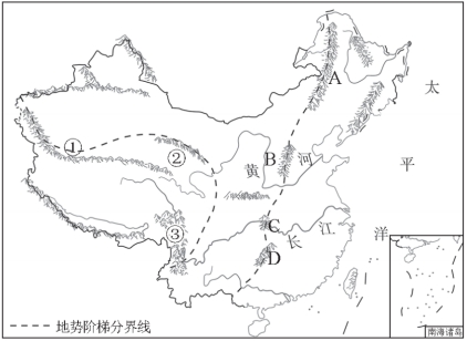 读我国地势三级阶梯示意图,完成7~8题。