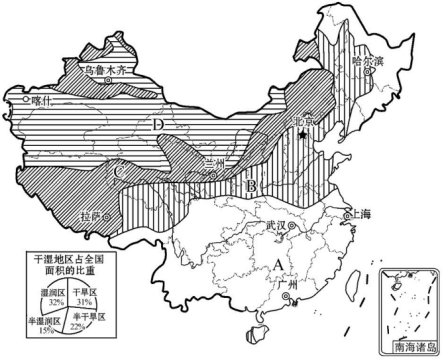 (2)A、B 干湿地区的分界线大体上通过________________(山脉)和________________(河流)一线,你能说出此线附近还有哪些重要的地理界线通过吗?