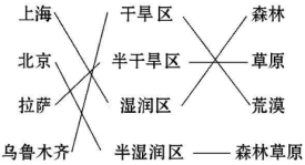 (3)将下列城市与对应的干湿地区、植被类型连起来。