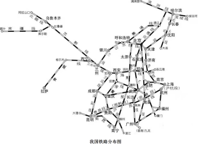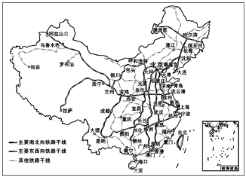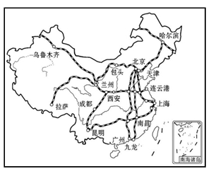 2020年第28届(西安)国际AGV暨智能物流展览会原定于3月12日至3月14日在我国最大的中西部设施最完备、规模最宏大的国际会展中心举行。结合图中国铁路干线分布图,回答5~6题。