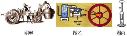 材料一:1769年,法国人居纽制造出蒸汽机推动的三轮汽车(图甲),传统蒸汽机的燃料在气缸外部燃烧(图乙),热效率为5%~8%之间。