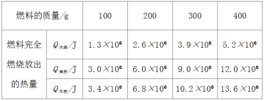 1.木柴、焦炭、木炭等都是常用的燃料,对它们取不同质量进行完全燃烧,得到了下表所示的数据。