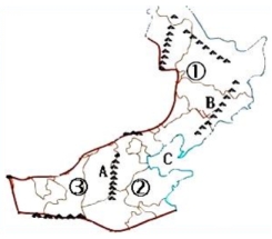 (2)写出相关地理事物:山脉:A________;E________;C________。山脉D东侧的地形为________________,西侧的地形区为________________。