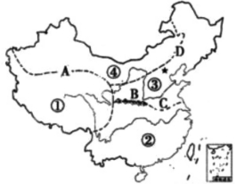 (1)图中数字①是________地区,A线是该区与其他三个地区的界线,确定这条界线的主导因素是________。④是________地区,该区与地区③的界线D大致与________毫米年等降水量线分布一致。